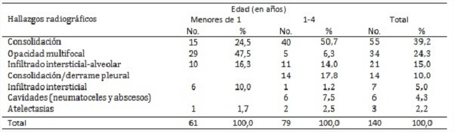Los hallazgos radiográficos (tabla 3) revelan que las imágenes de consolidación fueron las más frecuentes (39,2 %), particularmente en el grupo de 1-4 años, en tanto las opacidades multifocales predominaron en los lactantes.