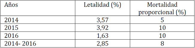 La letalidad por neumonía en el trienio mostró la cifra más baja en el 2016, en correspondencia con un mayor número de casos por la enfermedad en ese año y un solo deceso. Por otro lado, la tasa de mortalidad proporcional más baja se obtuvo en el 2014, con la muerte de un paciente y mayor frecuencia de decesos por todas las causas en el período.