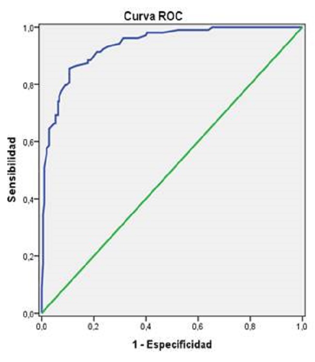 Construcción y validación del modelo de predicción: Una vez identificados los factores de riesgo con influencia independiente se procedió a la creación del índice predictivo. Se consideró que este debía estar formado por ítems que se integrarían en un índice global que tomaría la forma de una combinación lineal entre los ítems. A cada una de las variables retenidas por el modelo generado mediante la regresión logística se le asignó un puntaje a través de la amplificación de su coeficiente de regresión (se multiplicó por 10 y se aproximó a números enteros). Una vez confeccionado el índice predictivo se sometió a un estudio de eficacia diagnóstica y se generaron curvas receptor- operador (ROC, por sus siglas en inglés).