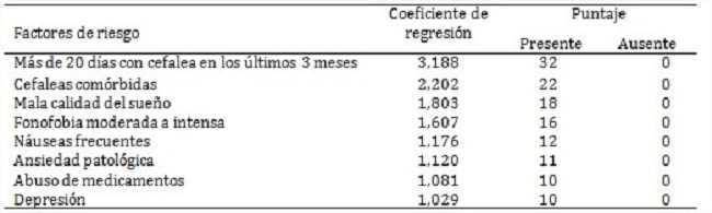 La estructura del índice de predicción cuantitativo (tabla 1), construido a partir del análisis multivariado consta de 8 variables, de las cuales la mayor puntuación la obtuvo la relacionada con la frecuencia de días con cefaleas en los últimos 3 meses (32 puntos).