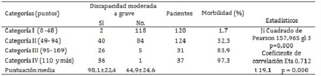 Al analizar la creación de categorías ordinales de riesgo, basadas en el índice construido y su relación con el grado de discapacidad (tabla 2), se encontró una excelente asociación (coeficiente Eta 0,712), donde 97,3 % de los pacientes con alto riesgo de desarrollar DMG fueron clasificados en la categoría IV.