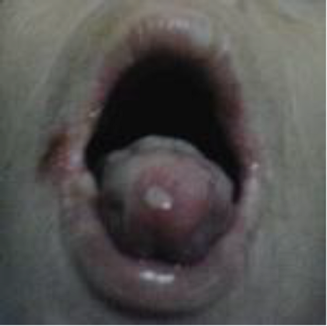 Vesículas de aproximadamente 0,5 cm de diámetro, cubiertas por una membrana blanca grisácea, con bordes hiperémicos en la punta de la lengua y en la región derecha del labio inferior, muy próxima a la comisura labial derecha; también se observó una úlcera en la comisura labial izquierda (fig 1).