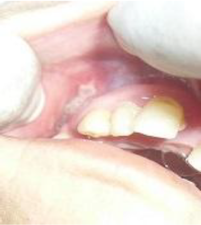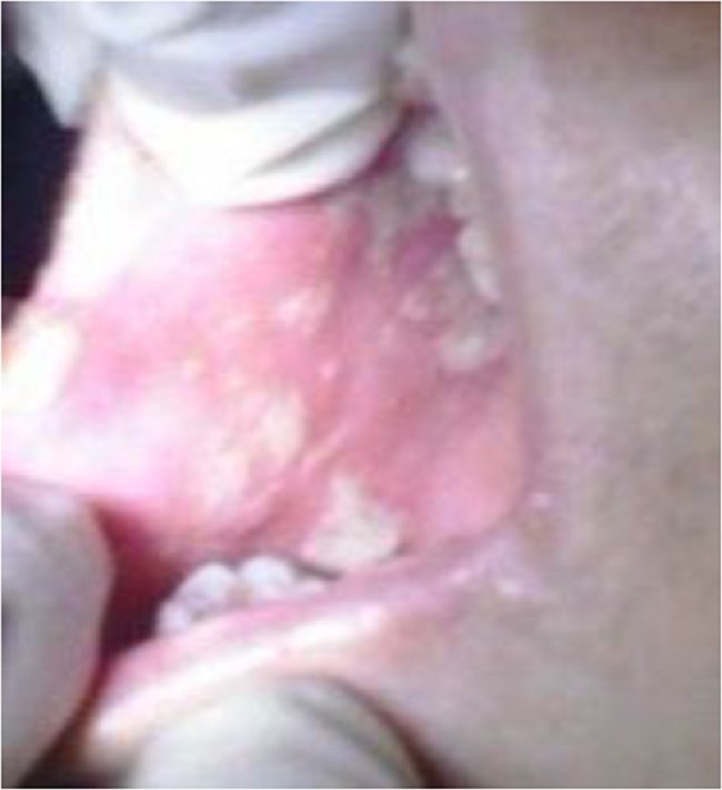 Lesiones vesiculosas, confluentes en placas blanquecino-grisáceas, ligeramente elevadas, con bordes hiperémicos en la región superior central e inferior del carrillo derecho (fig 2), en la mucosa interna del labio superior izquierdo y en el fondo del surco vestibular derecho que abarca la región canino, primera y segunda bicúspide (fig 3). Se palpa adenopatía mandibular bilateral.