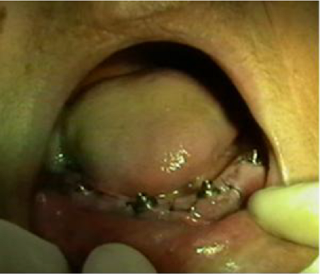 El cuidado posoperatorio consistió en enjuague bucal con clorhexidina a 2 %, dos veces al día durante 7 días, sin cepillado mecánico en las áreas quirúrgicas. Se prescribió amoxicilina de 500 mg cada 12 horas por 7 días e ibuprofeno de 400 mg cada 8 horas por 3 días. Se recomendó dieta blanda las primeras semanas y evitar los alimentos duros durante el periodo de cicatrización de 3 meses, para limitar las fuerzas funcionales mientras ocurría la osteointegración.