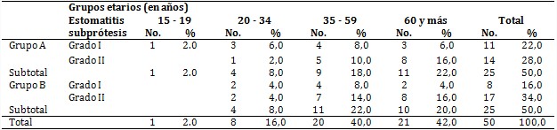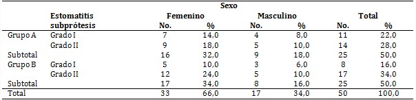 En la serie predominó el sexo femenino en los pacientes con estomatitis subprótesis grado II, con 9 (18,0 %) en el grupo A y 12 (24,0 %) en el B (tabla 2).