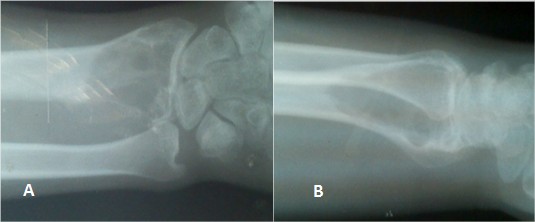 Caso 1. Se presenta el caso clínico de un paciente de 49 años de edad, oficial de la Policía Nacional Revolucionaria, que sufrió traumatismo en el tercio distal del radio izquierdo desde hacía 3 años aproximadamente.