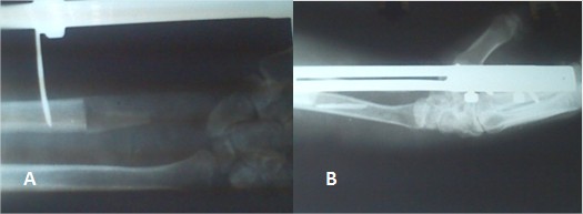 En ambos casos, teniendo en cuenta los datos al interrogatorio, el examen físico y las imágenes radiográficas, se decidió realizar la exéresis en bloque del tumor, con conservación del miembro afectado, así como injerto del hueso (previa coordinación con el banco de hueso de la provincia y estudios de compatibilidad), además de fijación externa (fijas del carpo) para lograr estabilidad del tercio distal del radio cubital (Fig.2).