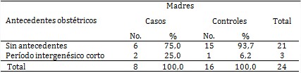 Como se muestra en la tabla 2, en ambos grupos predominaron las madres sin antecedentes obstétricos desfavorables (75,0 y 93,7 %, respectivamente); sin embargo, entre las que sí lo tuvieron, prevaleció el período intergenésico corto (25,0 y 6,2 %, para uno y otro grupo), para un riesgo relativo de 5.