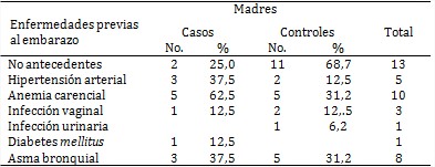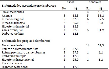 Results: Previous diseases and diseases characterizing pregnancy, fundamentally anemia and vaginal infection prevailed in the series; while preterm childbirth had a high statistical significance.