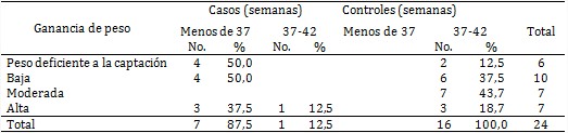 En la casuística se encontró que 50 % de las madres de los recién nacidos con bajo peso comenzaron la gestación con un estado nutricional deficiente, hecho que se presentó solo en 12,5 % del grupo control. Como se señala en la tabla 5 predominaron las madres con una ganancia baja de peso (50 %), no así en el grupo control, donde 43,7 % presentó una ganancia moderada, según las tablas antropométricas para embarazadas. En cuanto a la edad gestacional al momento del parto, en 87,5 % de los casos se presentó antes de las 37 semanas; mientras que el total de los controles fueron partos a término.