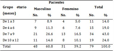 Como se aprecia en la tabla 1, predominaron el sexo masculino, con 60,5 %, y el grupo etario de 7 a 9 meses, con 43,0 %.