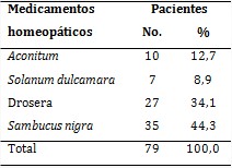 El más utilizado de los remedios homeopáticos fue el Sambucus nigra en 44,3 %, seguido de la drosera en 34,1% (tabla 2).