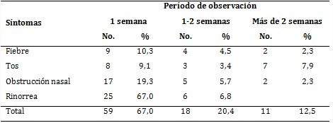 Por otra parte, la intensidad de los síntomas durante el periodo de observación fue de 1 semana para 67,0 % de los pacientes (tabla 3).