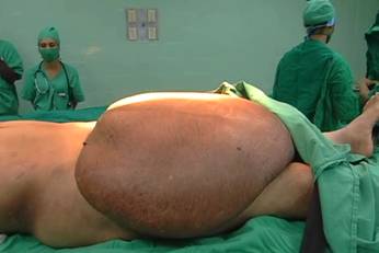 Existía un gran tumor escrotal, donde el pene resultante de la falectomía quedaba retraído y no podía ser observado ni palpado.
