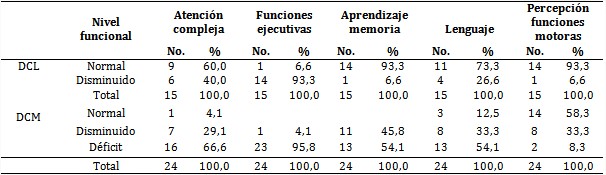 En el grupo con deterioro cognitivo mayor prevaleció el nivel de funcionamiento deficitario en todos los dominios explorados, excepto en el de percepción y funciones motoras, donde sobresalió el funcionamiento normal en 58,3 % de los afectados y el disminuido en 33,3 %. Obsérvese que el nivel de funcionamiento deficitario en las funciones ejecutivas resultó ser el de mayor frecuencia en este grupo de enfermos. Por tanto, el perfil neuropsicológico del nivel de deterioro cognitivo mayor se caracterizó por un funcionamiento deficitario en todos los dominios, más acentuado en las funciones ejecutivas, excepto en las funciones perceptuales y motoras, donde el nivel de funcionamiento prevaleciente osciló entre normal y disminuido.