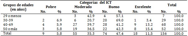 Los resultados obtenidos se corresponden con un estudio realizado en Australia para evaluar factores predictores de pobre capacidad de trabajo en obreros mayores de 45 años de edad, quienes realizaban labores manuales, donde se obtuvo que el aumento de la edad no afectaba el ICT y estaba relacionado con la experiencia en la labor, pues realizaban las tareas adecuadamente debido a las habilidades adquiridas con el tiempo.2,7,8,9