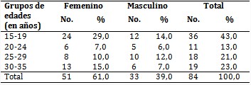En la serie (tabla 1) predominaron el sexo femenino (61,0 %) en relación con el masculino (39,0 %) y el grupo etario de 15-19 años (43,0 %).