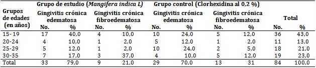 Como se muestra en la tabla 2, prevaleció la gingivitis crónica edematosa en ambos grupos de tratamiento (79,0 y 70,0 %, respectivamente), predominantemente en los afectados de 15-19 años, pero resulta válido destacar que en todos los grupos de edades ocupó la primacía.