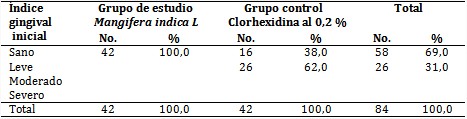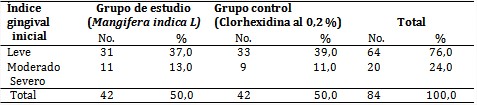 Methods: A study of therapeutic intervention was carried out in 84 patients with edematous and fibroedematous chronic gingivitis, assisted in Mártires del Moncada Teaching Provincial Stomatologic Clinic in Santiago de Cuba, from November, 2014 to the same month in 2015. The sample was divided in 2 groups (study and control) of 42 members each one, treated with topic watery extract of Mangifera indica L. and with watery solution of chlorhexidine at 0.2 %, respectively. The patients were evaluated at the beginning, at the 7, 14 and 21 days of having begun the treatment. A survey was applied for gathering the data and the Student T test, homogeneity test and the chi square test were used for the difference of samples, with p <0.05.