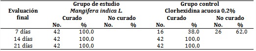 Resulta significativo señalar que a los 14 y 21 días de iniciado el tratamiento, el total de pacientes de ambos grupos mejoraron (tabla 5); también se demostró la efectividad del extracto acuoso de Mangifera indica L. en relación con las buchadas de colutorios de clorhexidina acuosa al 0,2 %, pues a los 7 días 100 % de los afectados del grupo de estudio estaban curados, sin la aparición de recidiva a los 14 y 21 de días, a diferencia de los controles, con solo 38,0 % de curación a los 7 días, pero con resultados similares a los del primer grupo a los 14 y 21 días.