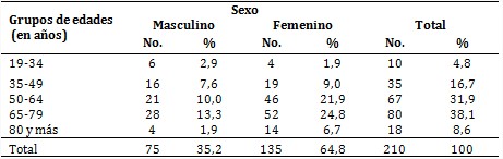 En la casuística (tabla 1) predominaron las féminas (64,8 %) y los grupos etarios de 65-79 años y de 50-64 (38,1 y 31,9 %, respectivamente). La media de edad fue de 61,1 años con una desviación típica de 14,6.