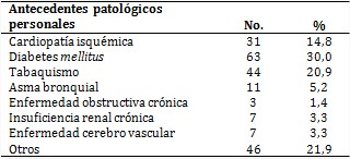 Igualmente, en el estudio sobresalieron las amas de casa (20,5 %), los jubilados (41,9 %) y los mestizos (45,7 %). Por otra parte, en la tabla 2 se aprecia que la diabetes mellitus fue la enfermedad asociada más frecuente (30,0 %), seguida por el tabaquismo (20,9 %).