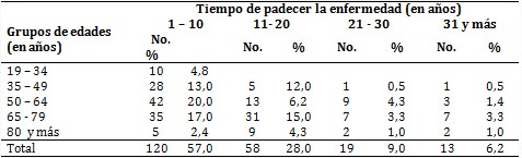 También se observó que 57,0 % de los pacientes padecía la enfermedad desde hacía 10 años; mientras que 27,6 % entre 11-20 años y solo 15,2 % más de 21 (tabla 3).