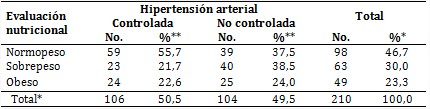Resulta válido destacar que 50,5 % de los pacientes mantenían las cifras de presión arterial controladas y, de estos, 55,7 % clasificaron como normopeso y 44,3 % como sobrepeso y obesos, lo cual constituye un factor de riesgo para la enfermedad de base. Por su parte, 49,5 % no mantenían dichas cifras controladas y 62,5 % se encontraba por encima del peso adecuado (tabla 4).