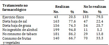 Se registró un número elevado de pacientes con tratamiento farmacológico (205, para 97,6 %), con al menos un fármaco; asimismo, la tabla 5 muestra que 85,7 % de los hipertensos encuestados tenía indicación de tratamiento no farmacológico y que 79,5 % de ellos no cumplía con la realización de ejercicios físicos.