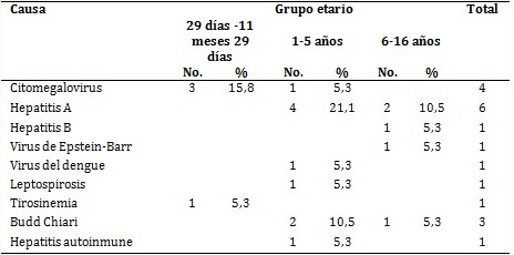 La tabla 1 muestra un predominio de la infección por citomegalovirus en los menores de un año con 3 pacientes para 15,8 % y fue en este grupo etario donde se diagnosticó el único caso de la serie con alteración metabólica. La infección por el virus de la hepatitis A constituyó la causa más común en el grupo de 1-5 años de edad con 4 niños para 21,1 %; dicho virus también fue la etiología más frecuente en el grupo etario mayor de 5 años (10,5 %)