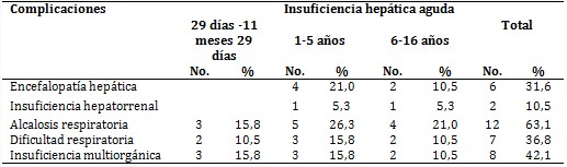Las complicaciones de mayor observancia fueron la alcalosis respiratoria (63,1 %), la insuficiencia multiorgánica (42,1 %) y la encefalopatía hepática (31,6 %); todas ellas predominaron en los preescolares (tabla 2).