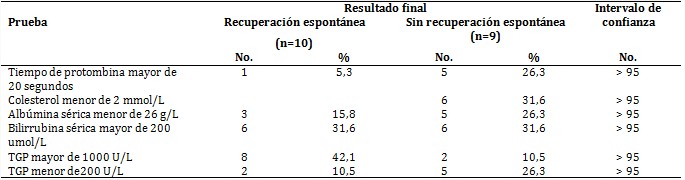 Como se observa en la tabla 3, sobrevivieron 12 pacientes (63,1 %), la tasa de letalidad alcanzó 36,8 %; la mayoría de los decesos presentaron el TP mayor de 20 segundos, cifras de colesterol por debajo de 2 mmol /L y descenso brusco de la TGP.