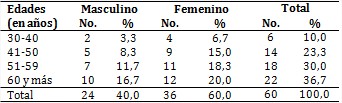 En la serie (tabla 1) predominaron el grupo etario de 60 años y más (36,7 %) y el sexo femenino (36,0 %).
