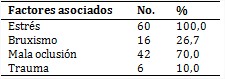 La tabla 2 muestra los factores asociados a la aparición del síndrome de ATM, donde se destaca el estrés como el más frecuente con 60 pacientes para 100,0 %, seguido de la mala oclusión con 70,0 % y, por último, el bruxismo y los traumas con 26,7 y 10,0 %, respectivamente.