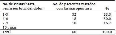 En la tabla 3 se observa que la mayoría de los pacientes aliviaron el dolor entre 1 y 3 días (32 para 53,3 %), seguidos del grupo de 4 - 6 días (18 para 30,0 %); no hubo afectados en el grupo de 10 y más sesiones de tratamiento.