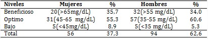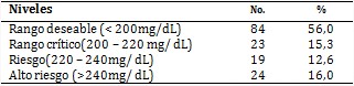 Como se observa en la tabla 1 existió una marcada incidencia de niveles de colesterol por encima del rango deseable, 66 pacientes presentaron niveles entre rango crítico y alto riesgo; 16,0 % fue clasificado en la categoría de alto riesgo, pues poseían niveles de colesterol superiores a 240 mg/dL.