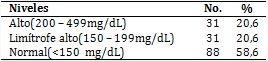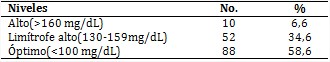 En relación con los niveles de lipoproteína de baja densidad (tabla 3), 10 pacientes (6,6 %) presentaron niveles altos y 52 (34,6 %) limítrofe alto.