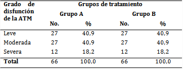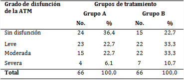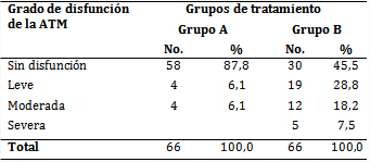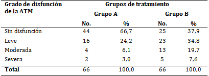 Como se observa en la tabla 4, al finalizar la quincena se encontraron 58 pacientes sin disfunción de la ATM en el grupo A y 4 en las categorías leve y moderada, respectivamente. En el grupo B, solo 45,5 % de los afectados no presentaron síntomas y 5 (7,5 %) se mantuvieron en la categoría de disfunción severa.