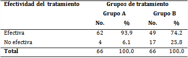 Al evaluar la efectividad del tratamiento (tabla 5), el estudio arrojó diferencias estadísticamente significativas entre ambos grupos al encontrar que p˂0,05. En el grupo A la terapia resultó efectiva en 93,9 % de los pacientes; sin embargo, en el grupo B esto no se logró, puesto que solo 74,2 % de los afectados remitieron el cuadro sintomático.