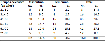En la casuística (tabla 1) predominaron el grupo etario de 61-70 años y el sexo femenino.