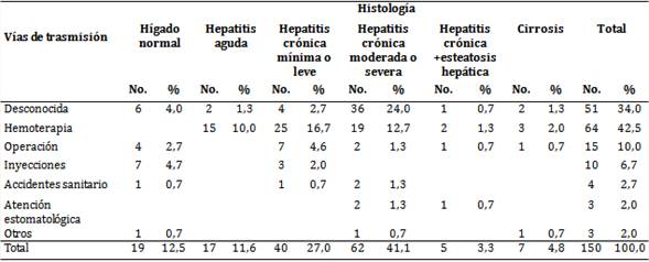 Por otra parte, en la tabla 2 se aprecia que la vía sanguínea (hemoterapia) resultó ser la de mayor riesgo para la transmisión del virus de la hepatitis C, con diferencias significativas entre el número de pacientes que adquirieron la enfermedad por dicha vía (42,5 %) con respecto a la quirúrgica (10,0 %) y a las inyecciones (6,7 %).