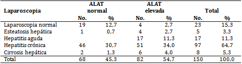 En la serie (tabla 3) hubo pacientes en los cuales el aspecto endoscópico del hígado fue normal y ya se evidenciaban cambios en las cifras de ALAT (2,7 %). A pesar de que 45,3 % estaban infectados por el virus, en algunos momentos de la enfermedad evolucionaron con valores de ALAT normal; mientras que en 54,7 % estuvieron elevados.