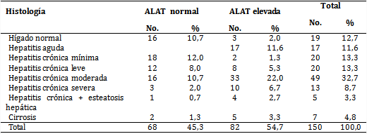 Como se muestra en la tabla 4, la mayoría de los pacientes (87,7 %) presentaba alteraciones histológicas relacionadas con el virus. Según los resultados de las biopsias, 76,1 % fueron clasificados con hepatitis crónica y de ellos 32,7 % tenían cifras normales de ALAT; en tanto, todos los diagnosticados con hepatitis aguda presentaban la ALAT elevada (tabla4).