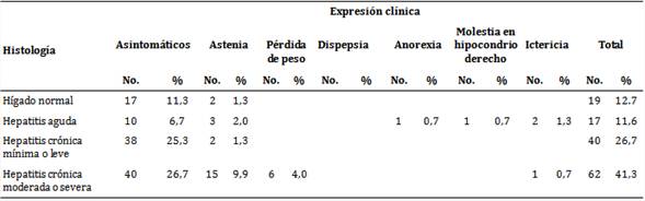 De los 105 pacientes asintomáticos, 88 presentaron lesiones histopatológicas (78 crónicas y 10 agudas), la mayoría de ellos con hepatitis crónica de moderada a severa (26,7 %), seguida por lesiones crónicas de mínima a leve (25,3 %). Cabe destacar que 87,7 % sufrió algún grado de lesión histológica (tabla 5).