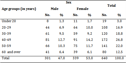 Table 1 highlights the predominance of patients between the ages of 40 and 49, 172 patients for 26.8%, and the predominance of women, 339 females for 53% of all cases. The extreme ages: under 20 and over 60, reported a lower percentage of patients (3% and 12.5%, respectively).