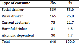 In table 4, social drinkers lead the results: 339 representing 53%; followed by high risk drinkers, 165 for 25.8%, and a lower percentage was revealed in alcoholic dependents.