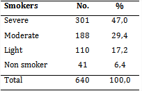 Table 5 shows the prevalence of smokers with severe smoking, 301 for 47.0%. Only 41 patients (6.4%) were not smokers.