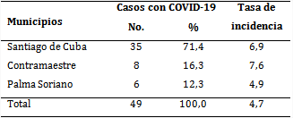 En la provincia de Santiago de Cuba se registraron 49 pacientes con la COVID-19, los que provenían predominantemente del municipio de Santiago de Cuba (71,4 %), seguido de Contramaestre (16,3 %) y Palma Soriano (12,3 %). Sin embargo, la mayor tasa de incidencia correspondió a Contramaestre (7,6 por 105 habitantes). Cabe destacar la inexistencia de brotes o episodios en instituciones o aglomeraciones de personas durante la epidemia, lo cual también influyó en la baja incidencia en este territorio (tabla 1).