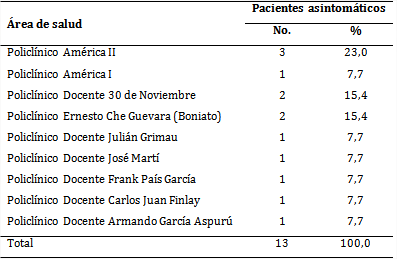 Entre los pacientes asintomáticos en el momento del diagnóstico, 4 pertenecían al municipio de Contramaestre (contactos de viajeros procedentes de los Estados Unidos): 3 de ellos del área de salud América II y el otro de América I, y los 9 restantes correspondían al municipio de Santiago de Cuba (tabla 2).