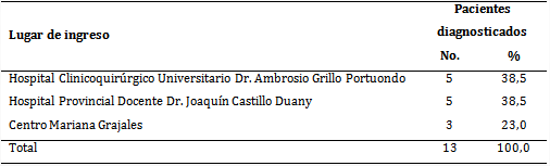 En cuanto a los centros donde se hallaban ingresados estos casos al ser diagnosticados, figuraron 2 hospitales y un centro de aislamiento (tabla 3).